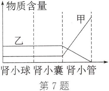 7. (2024·眉山)如图中甲、乙两条曲线表示肾单位形成尿液的过程中,肾小球中的血浆、肾小囊中的原尿、肾小管中的尿液中两种物质含量的变化情况,曲线乙代表的物质是( )