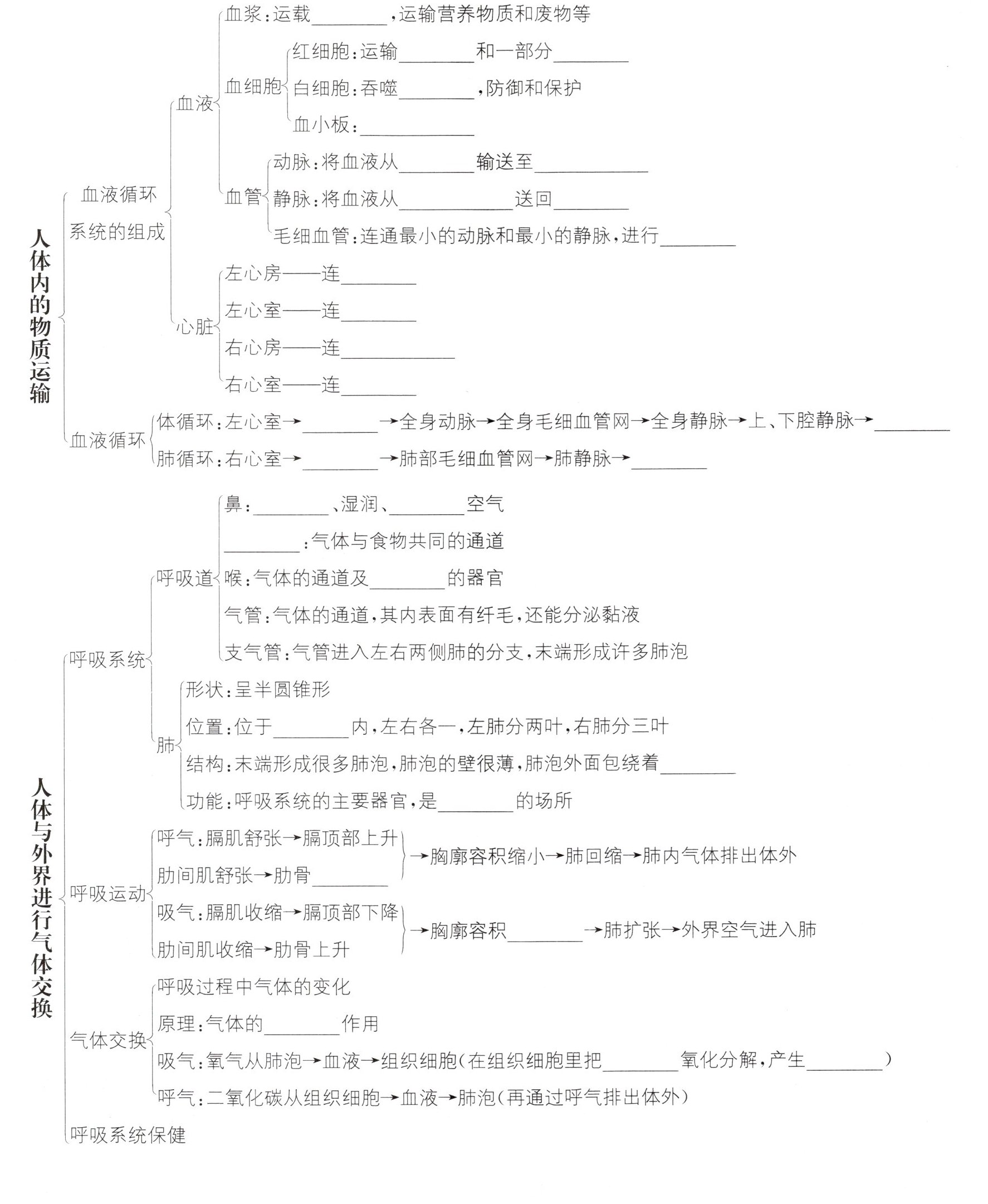 血细胞 氧 二氧化碳 病菌 止血和凝血 心脏 身体各部分 身体各部分 心脏 物质交换 肺静脉 主动脉 上、下腔静脉 肺动脉 主动脉 右心房 肺动脉 左心房 温暖 清洁 咽 发声 胸腔 毛细血管 气体交换 下降 扩大 扩散 有机物 二氧化碳 肾脏 肾小球 肾小管 滤过 重吸收 毛细血管