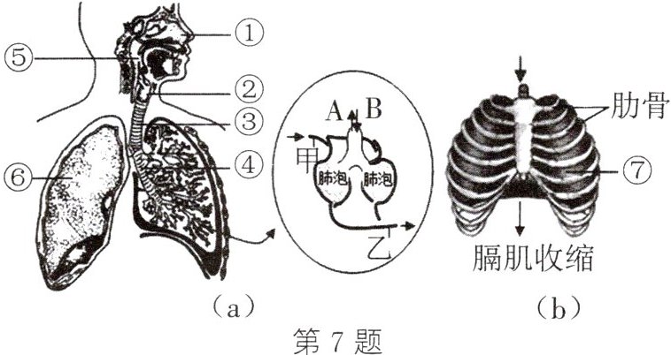 7. 图(a)表示人体呼吸系统的组成,图(b)表示人体进行呼吸时呼吸肌的状态。①~⑥表示器官,A、B表示呼气和吸气过程,甲、乙表示血管。请据图回答下列问题: