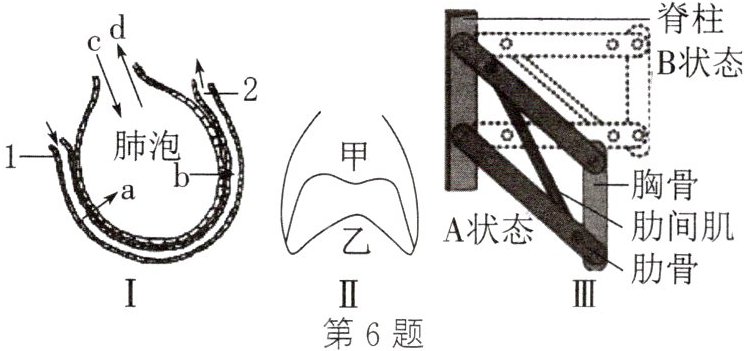 D 解析:图Ⅰ为肺泡与毛细血管之间的气体交换示意图,血液从1端流到2端后,血液中氧气增多,二氧化碳减少,a是二氧化碳,b是氧气,c是吸气,d是呼气;图Ⅱ中,甲代表的是呼气(膈肌舒张),乙代表的是吸气(膈肌收缩);图Ⅲ表示的是呼吸运动时肋骨和胸骨的变化。