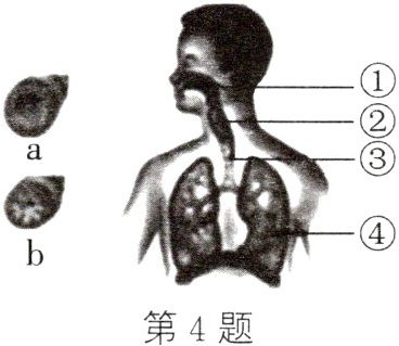 (2)图(a)中食物和气体的共同通道是______,人体与外界进行气体交换的场所是______。(填序号)(3)图(a)中的肺泡壁和毛细血管壁都由______层细胞构成,这有利于进行______交换。