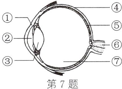 7. 如图为眼球结构模式图。请结合所学知识回答: