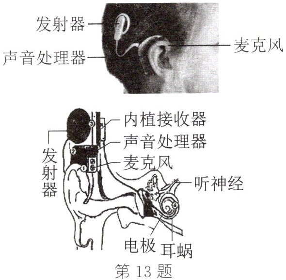 13. (新情境)耳聋是老年人的一种常见病,儿童也会因遗传或发育异常等因素出现耳聋,病情严重时患者会完全丧失听力。随着科技的发展,现在全世界已把人工耳蜗作为治疗重度耳聋和全聋的常规方法。如图是人工耳蜗的工作原理,请据图回答问题:
