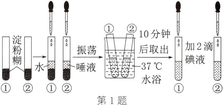 5. 探究唾液淀粉酶对淀粉的消化作用:将2支试管振荡后放在______的水中恒温保存约10 min。取出冷却后,向2支试管中各滴加2滴______,观察2支试管中颜色的变化。