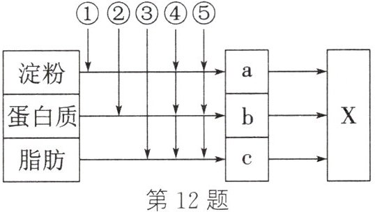 12. 如图表示人体消化过程,①~⑤表示消化液。纵向箭头表示消化液对相应物质的消化作用,a、b、c分别表示淀粉、蛋白质和脂肪的最终消化产物。据图回答下列问题: