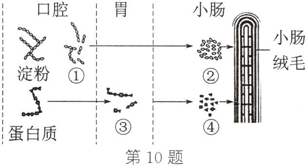10. 如图是淀粉、蛋白质在人的口腔、胃、小肠中的消化和吸收过程示意图,其中①~④表示消化产物,请据图回答问题:
