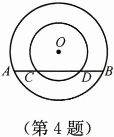 4. 如图,在以点$O$为圆心的两个同心圆中,大圆的弦$AB交小圆于点C$、$D$。已知$AB= 4$,$CD= 2$,圆心$O到直线AB$的距离为1,则大圆的半径为______,小圆的半径为______。