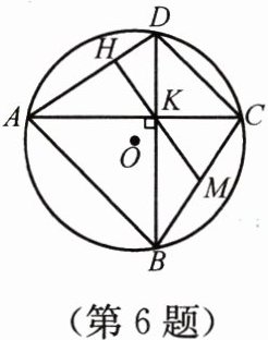 6. 如图,在 $\odot O$ 的内接四边形 $ABCD$ 中,$AC\perp BD$,垂足为 $K$,$M$ 是 $BC$ 的中点,直线 $MK$ 交 $AD$ 于点 $H$。$KH$ 与 $AD$ 有怎样的位置关系?为什么?
