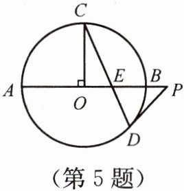 5. 如图,$AB是\odot O$的直径,半径$OC\perp AB$,$P是AB$延长线上一点,$PD切\odot O于点D$,$CD交AB于点E$.判断$\triangle PDE$的形状,并说明理由.