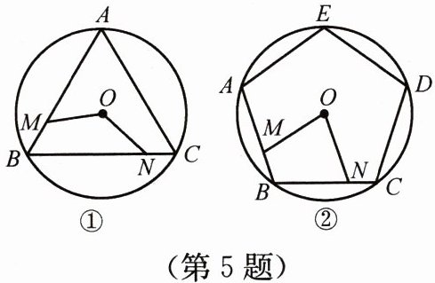 5. 如图①、②,点 M、N 分别在 $ \odot O $ 的内接正三角形 ABC、内接正五边形 ABCDE 的边 AB、BC 上, $ BM = CN $. 分别求图①、图②中 $ ∠MON $ 的度数,并说明理由.