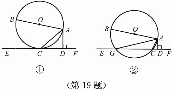 19. 如图①,$AB是\odot O$的直径,$AC是\odot O$的弦,直线$EF与\odot O相切于点C$,$AD\perp EF$,垂足为$D$.