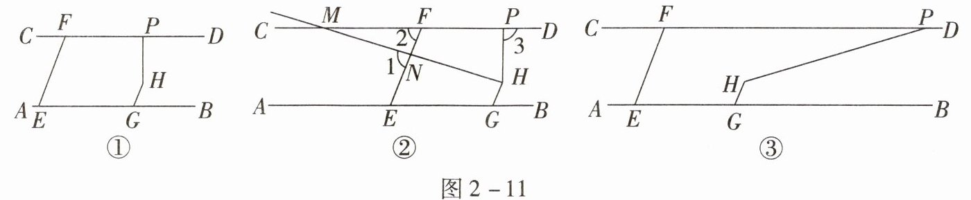 11. 如图2-11①,已知$AB// CD$,$∠BGH= ∠EFC$,点P为直线CD上一动点.