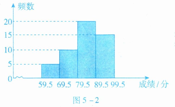 4. 八年级(1)班全体学生参加了学校举办的安全知识竞赛,图 5 - 2 是该班学生竞赛成绩的频数分布直方图(满分为 $ 100 $ 分,成绩均为整数),若将成绩不低于 $ 90 $ 分的评为优秀,则该班这次成绩达到优秀的人数占全班人数的______