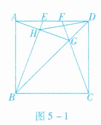 3. 如图 5 - 1 所示,$ E $,$ F $ 是正方形 $ ABCD $ 的边 $ AD $ 上的两个动点,满足 $ AE = DF $. 连接 $ CF $ 交 $ BD $ 于点 $ G $,连接 $ BE $ 交 $ AG $ 于点 $ H $. 若正方形的边长为 $ 2 $,则线段 $ DH $ 长度的最小值是______