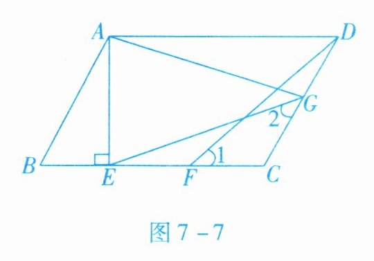 5. 如图7-7所示,在$□ ABCD$中,$AE\perp BC$,垂足为E,$CE= CD$,点F为CE的中点,点G为CD上的一点,连接DF,EG,AG,$\angle 1= \angle 2$.