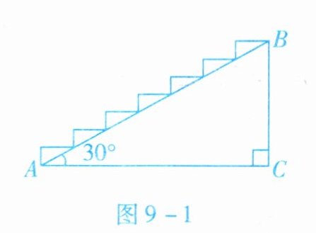 4. 某楼梯的侧面图如图 9 - 1 所示,其中 $ A B = 4 \mathrm { m } $,$ \angle B A C = 30 ^ { \circ } $,$ \angle C = 90 ^ { \circ } $,因某种活动要求铺设红色地毯,则在 $ A B $ 段楼梯所铺地毯的长度应为