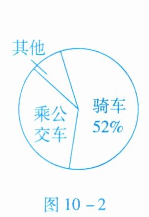 4. 某班主任把本班学生上学方式的调查结果绘制成如图 10 - 2 所示的不完整的统计图,已知乘公交车上学的学生有$20$人,骑车上学的学生有$26$人,则乘公交车上学的学生人数在扇形统计图中对应的扇形的圆心角的度数为