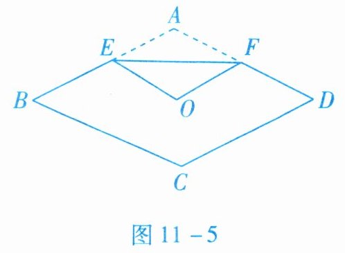 7. 如图 $ 11 - 5 $ 所示,将菱形纸片 $ ABCD $ 折叠,使点 $ A $ 恰好落在 $ BD $ 的中点 $ O $ 处,折痕为 $ EF $,若菱形 $ ABCD $ 的边长为 $ 2 \, cm $,$ \angle A = 120° $,则 $ EF = $