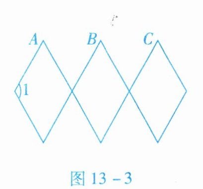 7. 如图13 - 3所示,一活动菱形衣架中,菱形的边长均为$16\mathrm{cm}$,若墙上钉子间的距离$AB = BC = 16\mathrm{cm}$,则$\angle 1 = $