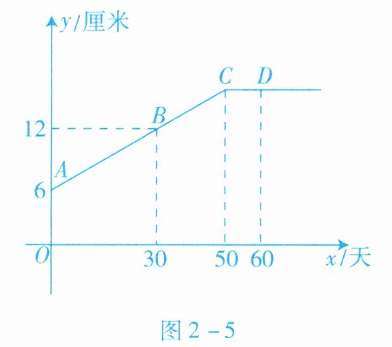1. 生物小组观察一植物生长,得到植物高度$y$(单位:厘米)与观察时间$x$(单位:天)的关系,并画出如图2 - 5所示的图象($AC$是线段,$CD平行于x$轴).