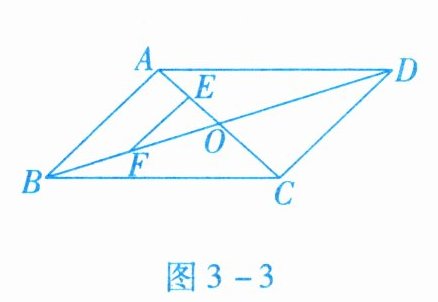 8. 如图 $ 3 - 3 $ 所示,$ □ ABCD $ 的对角线 $ AC $,$ BD $ 相交于点 $ O $,点 $ E $,$ F $ 分别是线段 $ AO $,$ BO $ 的中点。若 $ AC + BD = 24\ cm $,$ \triangle AOB $ 的周长是 $ 18\ cm $,则 $ EF = $