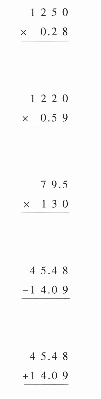 $\begin{array}{r r r}&&&&1&2&5&0 \\ ×&&&&&0.2&8 \\ \hline &&&&1&0&0&0&0\\&&&&2&5&0&0\\ \hline&&&&3&5&0&0&0\end{array}$