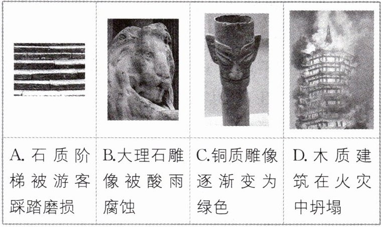 B [石质阶梯被游客磨损,没有生成新的物质,是物理变化,A错误;石质雕像主要成分为碳酸盐,被酸雨腐蚀,生成新物质,属于化学变化,但不是氧化还原反应,B正确;铜质雕像逐渐变为绿色,铜单质变为碱式碳酸铜,生成新物质,属于氧化还原反应,C错误;在火灾中发生燃烧而坍塌,燃烧属于氧化还原反应,D错误。]
