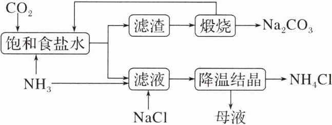 A [氨气极易溶于水,向饱和食盐水中通入氨气所得溶液呈碱性,继续通入过量二氧化碳形成碳酸氢钠的过饱和溶液,则析出碳酸氢钠晶体,主要反应为CO₂ + NH₃·H₂O = NH₄HCO₃、NH₄HCO₃ + NaCl = NaHCO₃↓ + NH₄Cl,可表示为CO₂ + NH₃ + H₂O + NaCl = NaHCO₃↓ + NH₄Cl,所得碳酸氢钠受热发生分解反应生成碳酸钠、水和二氧化碳,二氧化碳可以循环利用,向滤液中通入NH₃、加入食盐,通过降温结晶析出氯化铵晶体。应该向“饱和食盐水”中先通入足量NH₃,再通入过量CO₂,A正确;据分析,该工艺流程中没有发生氧化还原反应,B错误;滤渣的主要成分是NaHCO₃,在相同温度下碳酸氢钠溶解度比碳酸钠小,C错误;最终所得“母液”中含铵根离子、钠离子和氯离子,可循环利用,D错误。]