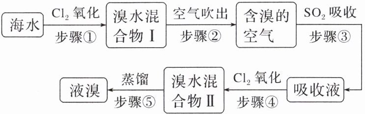 (1)由流程图和反应原理可写出步骤①反应的离子方程式和步骤②反应的化学方程式分别为 2Br⁻ + Cl₂ = Br₂ + 2Cl⁻,SO₂ + Br₂ + 2H₂O = 2HBr + H₂SO₄。
