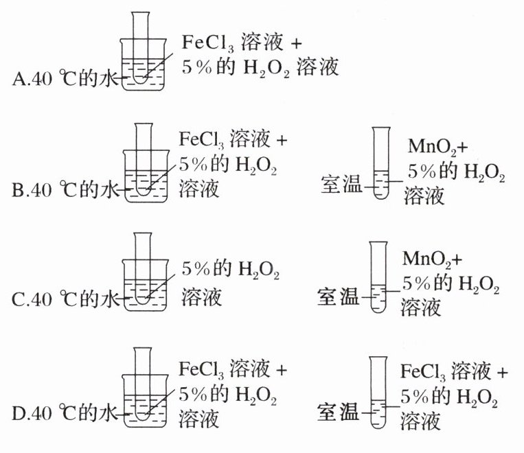 6. D [没有对比实验,A 错误;催化剂不同,温度不同,无法比较,B 错误;前者没有催化剂,后者有催化剂,无法比较,C 错误;只有温度不同,其他条件都相同,该方案可行,D 正确。]