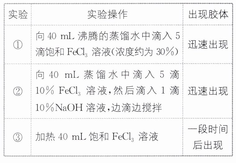 (2)根据实验①和③可知,向沸腾的蒸馏水中滴加饱和 $ FeCl_3 $溶液并加热,生成 $ Fe(OH)_3 $胶体的速度大于直接加热饱和 $ FeCl_3 $溶液,说明此时提供 $ OH^- $的物质是$ H_2O $,对比实验①和②可知,加入少量 NaOH 溶液后,即使不用饱和 $ FeCl_3 $溶液,也能生成 $ Fe(OH)_3 $胶体,此时提供 $ OH^- $的物质是 NaOH。