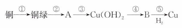 10. 铜器久置于空气中会和空气中的水蒸气、$CO_{2}$、$O_{2}$作用产生“绿锈”,该“绿锈”俗称“铜绿”,又称“孔雀石”[化学式为$Cu_{2}(OH)_{2}CO_{3}$],“铜绿”能跟酸反应生成铜盐、$CO_{2}和H_{2}O$。某同学利用下述系列反应实现了“铜→铜绿→……→铜”的转化。