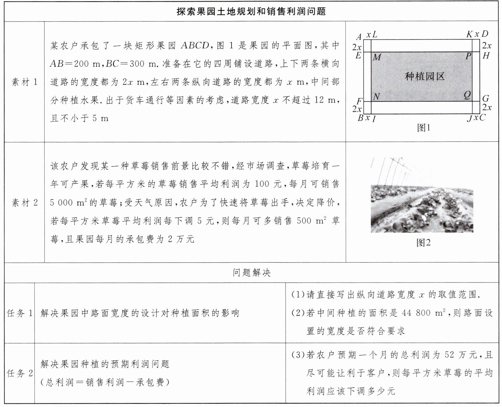 (2)根据题意,得(300-2x)(200-2×2x)=44800,整理,得x²-200x+1900=0,解得x₁=10,x₂=190(不合题意,舍去).