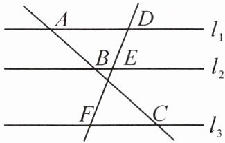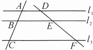 1. 如图,直线 $ l_{1} // l_{2} // l_{3} $,直线 $ AC $ 和 $ DF $ 被 $ l_{1} $,$ l_{2} $,$ l_{3} $ 所截,$ AB = 2 $,$ BC = 4 $,$ EF = 6 $,则 $ DE $ 的长为(