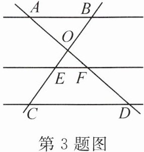 3. (2023·北京)如图,直线 $ AD $,$ BC $ 交于点 $ O $,$ AB // EF // CD $。若 $ AO = 2 $,$ OF = 1 $,$ FD = 2 $,则 $ \frac{BE}{EC} $ 的值为