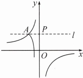 14. 新考向 新定义问题 如图,$ P $ 是 $ y $ 轴正半轴上的一个动点,过点 $ P $ 作 $ y $ 轴的垂线 $ l $,与反比例函数 $ y = -\frac{4}{x} $ 的图象交于点 $ A $. 把直线 $ l $ 上方的反比例函数图象沿着直线 $ l $ 翻折,其他部分保持不变,所形成的新图象称为“$ y = -\frac{4}{x} $ 的 $ l $ 镜像”. 当 $ OP = 3 $ 时,回答下列问题: