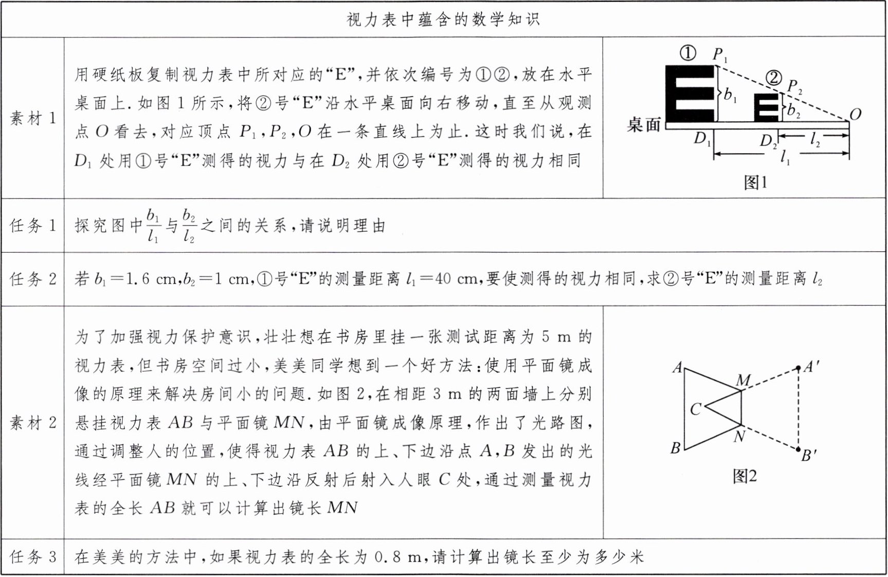 解:任务 1:$\frac{b_{1}}{l_{1}}=\frac{b_{2}}{l_{2}}$. 理由如下:$\because P_{1}D_{1}// P_{2}D_{2}$,$\therefore \triangle P_{1}D_{1}O\backsim \triangle P_{2}D_{2}O$.$\therefore \frac{P_{1}D_{1}}{P_{2}D_{2}}=\frac{D_{1}O}{D_{2}O}$,即$\frac{b_{1}}{b_{2}}=\frac{l_{1}}{l_{2}}$.$\therefore \frac{b_{1}}{l_{1}}=\frac{b_{2}}{l_{2}}$. 任务 2:$\because \frac{b_{1}}{l_{1}}=\frac{b_{2}}{l_{2}}$,且$b_{1}=1.6\ cm$,$b_{2}=1\ cm$,$l_{1}=40\ cm$,$\therefore \frac{1.6}{40}=\frac{1}{l_{2}}$.$\therefore l_{2}=25\ cm$.$\therefore$②号“E”的测量距离$l_{2}$为$25\ cm$. 任务 3:过点$C$作$CF\perp A'B'$于点$F$,交$MN$于点$E$. 由题意,得$A'B'=AB=0.8\ m$,$A'B'// MN$,$\therefore CE\perp MN$,$\triangle CMN\backsim \triangle CA'B'$.$\therefore \frac{CE}{CF}=\frac{MN}{A'B'}$. 由题意,得$CF=5\ m$,$EF=3\ m$,$\therefore CE=CF-EF=2\ m$.$\therefore \frac{2}{5}=\frac{MN}{0.8}$.$\therefore MN=0.32\ m$.$\therefore$镜长至少为$0.32\ m$.