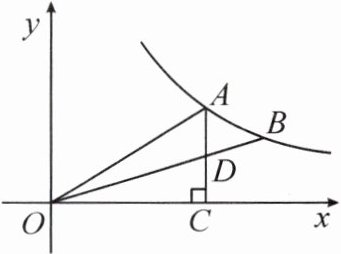 3. 如图,$ A $,$ B $ 是双曲线 $ y = \frac{k}{x}(x > 0) $ 上的两点,连接 $ OA $,$ OB $。过点 $ A $ 作 $ AC \perp x $ 轴于点 $ C $,交 $ OB $ 于点 $ D $。若 $ D $ 为 $ AC $ 的中点,$ \triangle AOD $ 的面积为 $ 3 $,点 $ B $ 的坐标为 $ (m,2) $,则 $ m $ 的值为