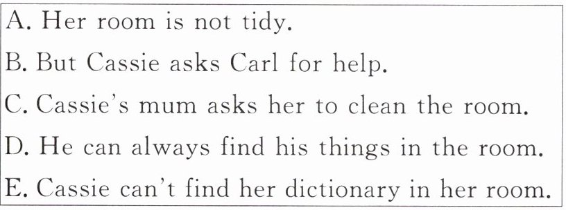 Cassie is a girl in Yuying Middle School. She is busy with her study all day. 26 Her things are everywhere(到处). And they are in a mess(杂乱). 27 She asks Cassie to put her things in the right places. 28 “Carl, can you come to my room now and help me clean it?” asks Cassie.