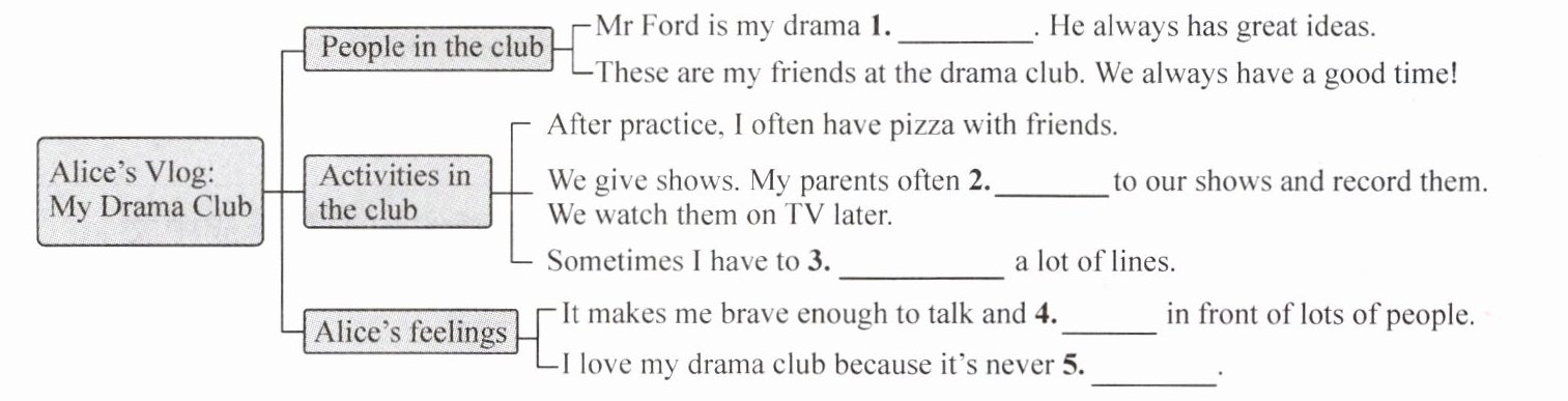 3. 【教材原句】The drama club can be hard when I have to remember a lot of lines... 当我不得不记住大量台词时,戏剧俱乐部的活动可能会很艰难……