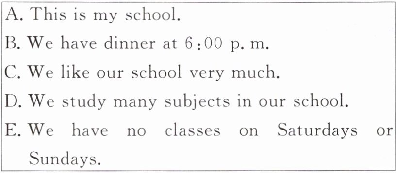 We go to school from Monday to Friday. 6 We usually get up at six and have breakfast at six thirty. We go to school at seven. Class begins at eight. We have four classes in the morning and two in the afternoon. We have lunch at twelve fifteen. At 4:00 p. m., we do sports. We go home at 5:00 p. m. 7 We do our homework at seven and finish it at nine every evening, and then we go to bed at half past nine. But sometimes we go to sleep at about ten.