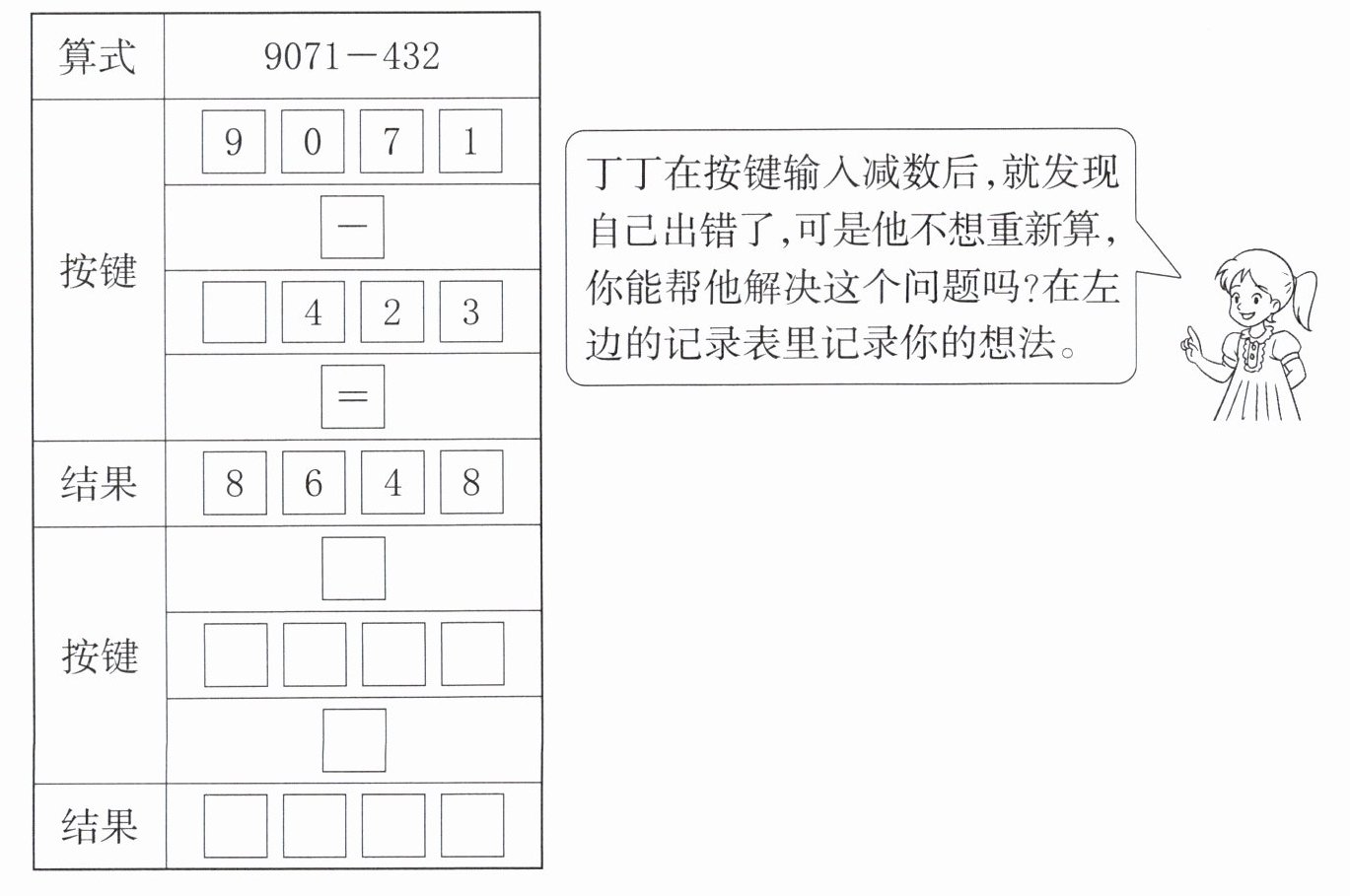 4. 丁丁用计算器计算$9071-432$,并记录了操作过程。