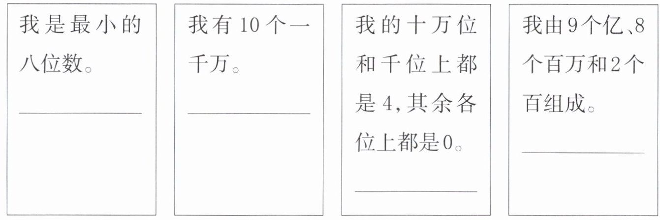 第一空:最小的八位数,就是最高位是1,其余位是0的数,即10000000,读作“一千万” 。