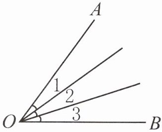 *7. 如下图,已知∠1= ∠2= ∠3,并且图中所有锐角的度数之和等于 180°,求∠AOB 的度数。(用角的两边和角的顶点的字母表示角时,顶点的字母写在中间)