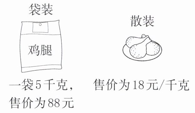 3. 在某超市,袋装和散装的鸡腿标价如下图所示。如果需要买15千克鸡腿,买哪一种包装的更便宜?需要多少元钱?