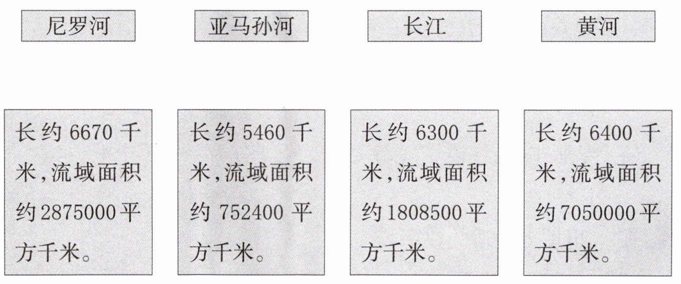 4. 世界上的河流,若以长度衡量,排第一位的是尼罗河,排第二位的是亚马孙河,我国的长江排第三,黄河排第五。请你根据以上信息连一连,并填一填。