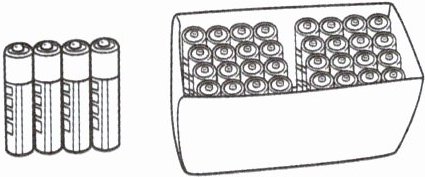 计算一盒能装多少节电池:已知每板电池有$4$节,$1$盒装$8$板,根据乘法的意义,用每板的节数乘以每盒的板数,可求出一盒能装的电池节数为$4× 8 = 32$(节)。