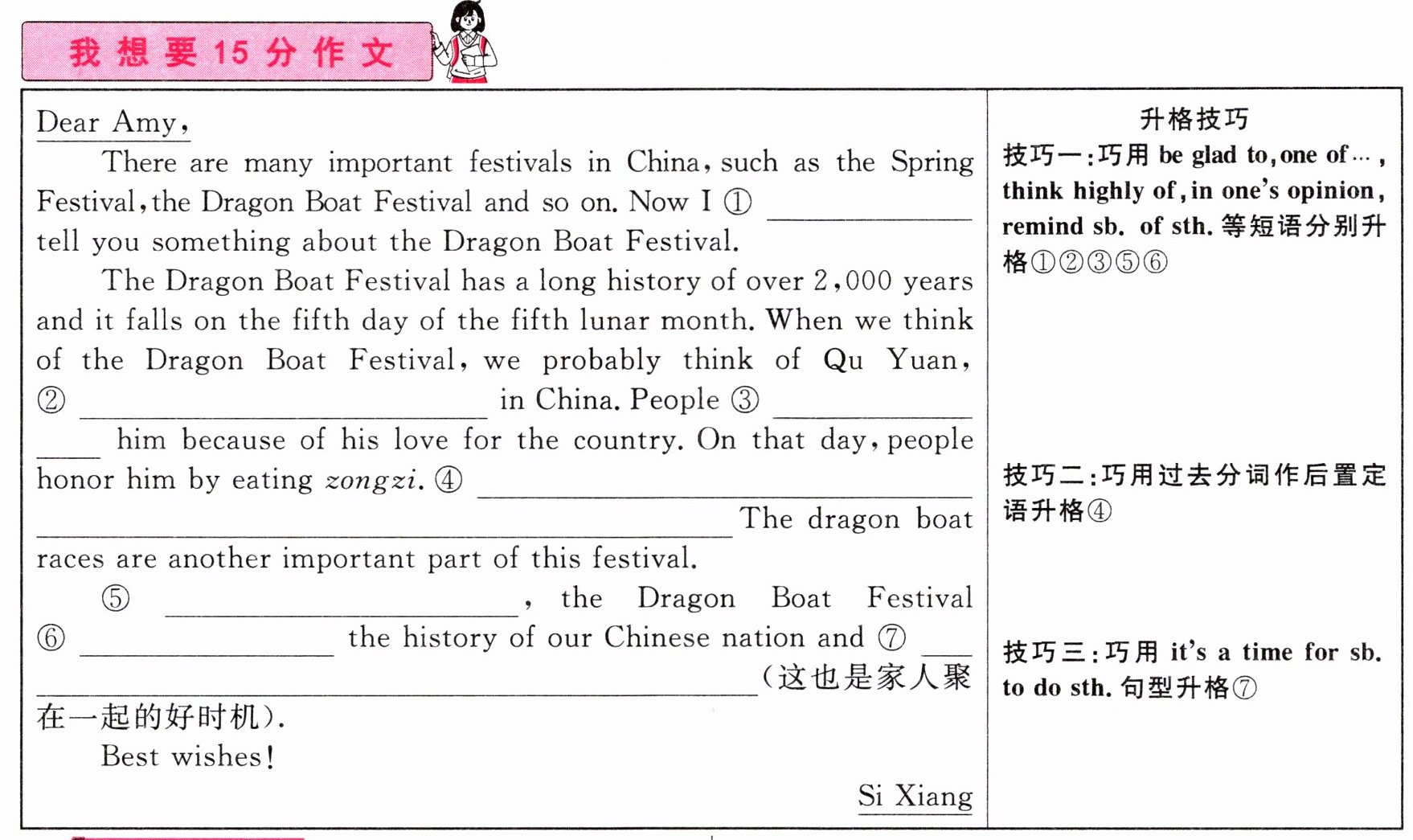我想要 15 分作文 ①am glad to ②one of the greatest poets ③think highly of ④It's a kind of traditional Chinese food made of rice with meat,eggs and so on. ⑤In my opinion ⑥reminds us of ⑦it is also a good time for the family to get together