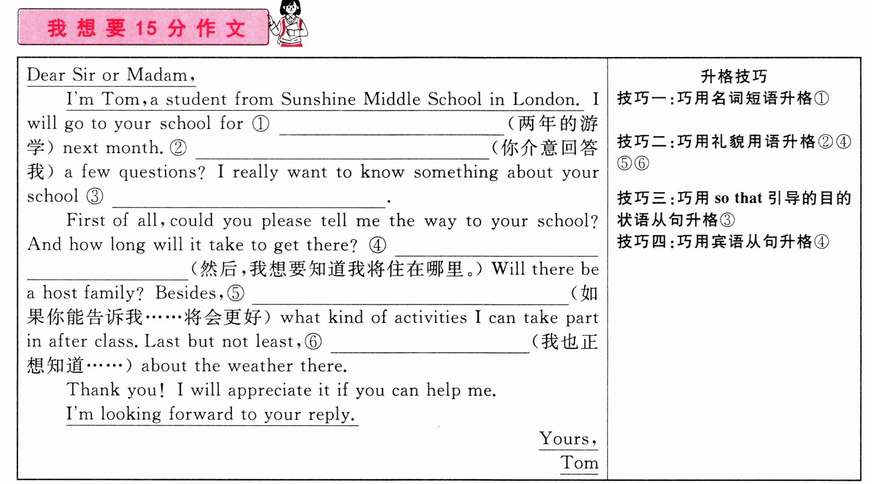 我想要15分作文 ①a two-year study tour ②Would you mind answering me ③so that I can prepare for it ④Then,I'd like to know where I will live. ⑤it will be better if you can tell me ⑥I'm also wondering