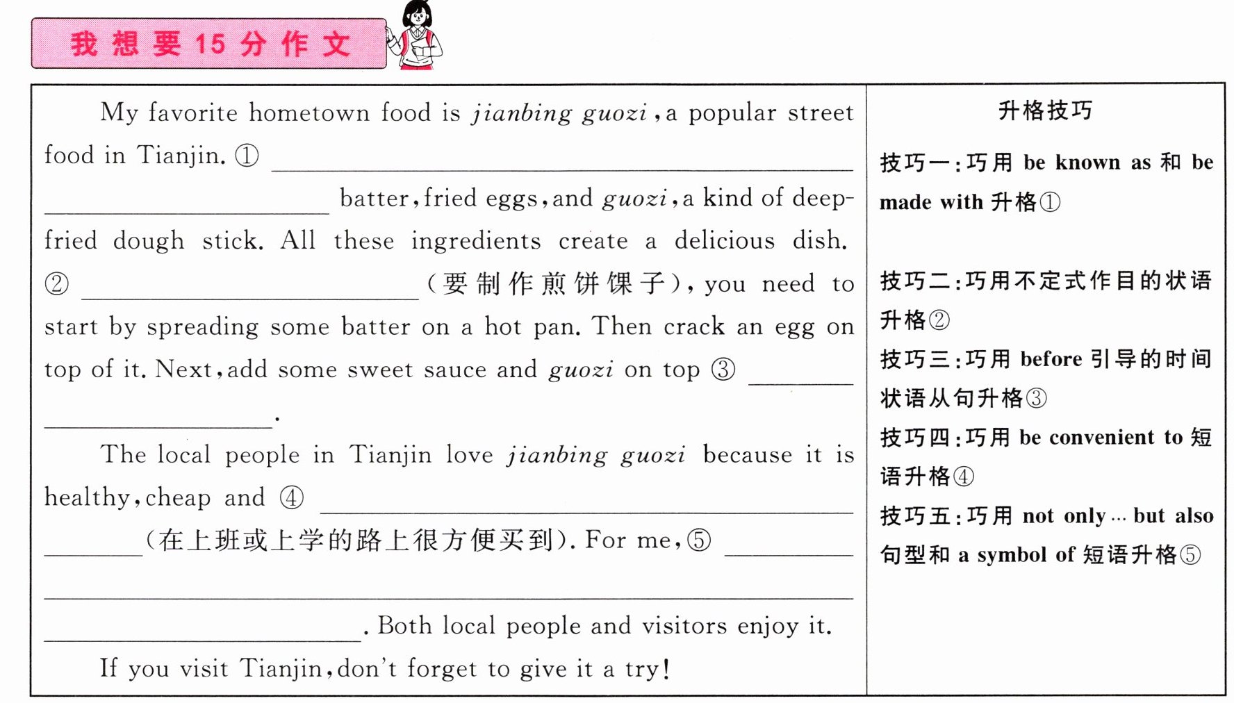 我想要 15 分作文 ①It is known as a traditional Chinese breakfast and mainly made with ②To make jianbing guozi ③before you roll it all up ④convenientto buy on the way to work or school ⑤jianbing guozi is not only a great breakfast,but also a symbol of Tianjin's special taste and culture